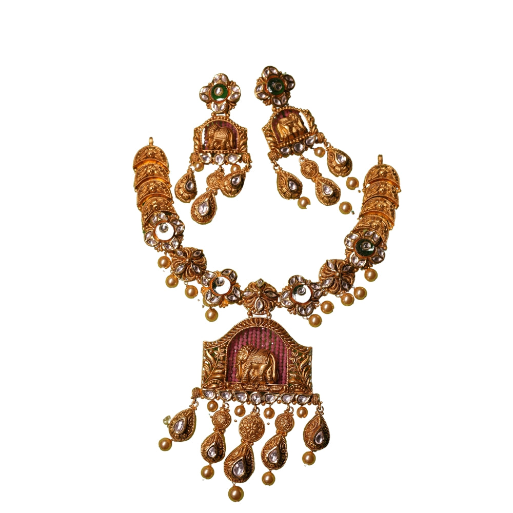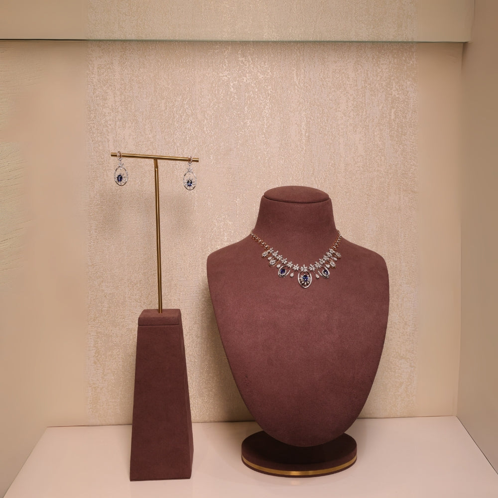 This exquisite necklace set showcases the stunning combination of sapphires and diamonds. The necklace features a delicate design with a central teardrop-shaped sapphire surrounded by sparkling diamonds. The matching earrings complement the necklace with their elegant teardrop shape and shimmering diamonds. The set is perfect for adding a touch of luxury and sophistication to any outfit, whether it's for a special occasion or everyday wear. The timeless design and high-quality craftsmanship make this necklace set a beautiful and versatile addition to your fine jewelry collection.